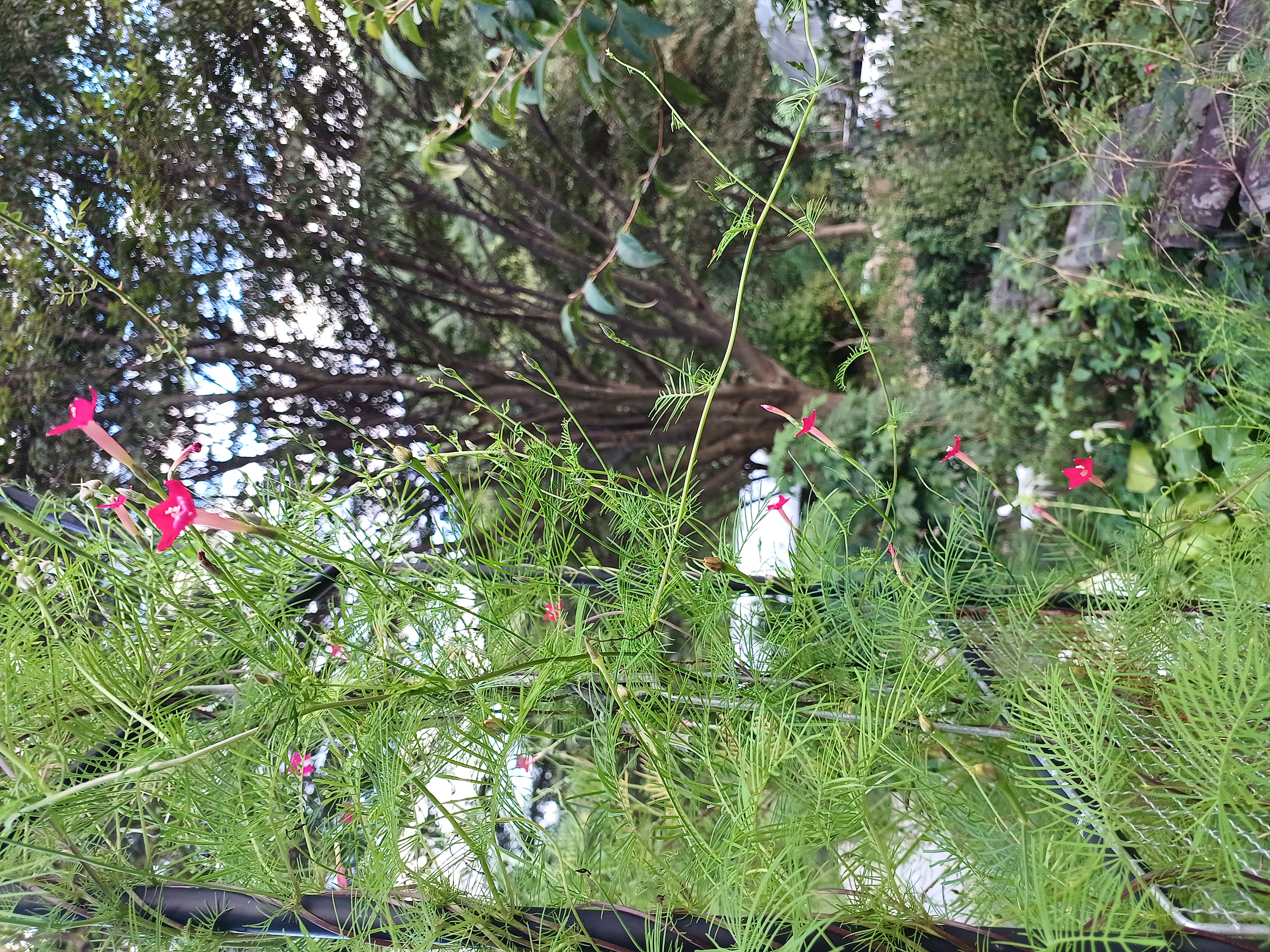 꽃이 앙증스럽게 작은 장미와 역시 꽃이 앙증스런 작을 펄 모양인 새깃유홍초가 아치 중앙에서 만난다