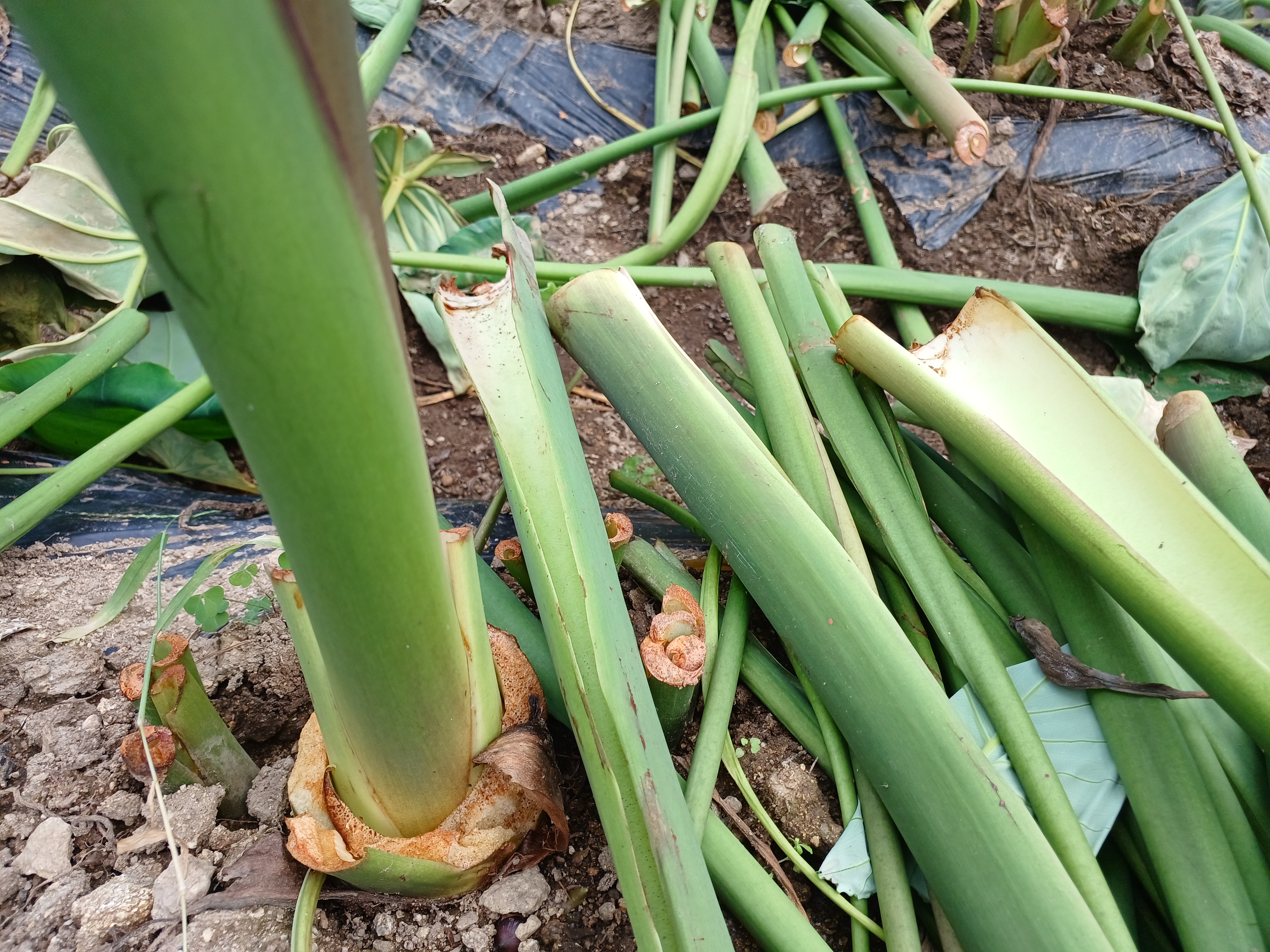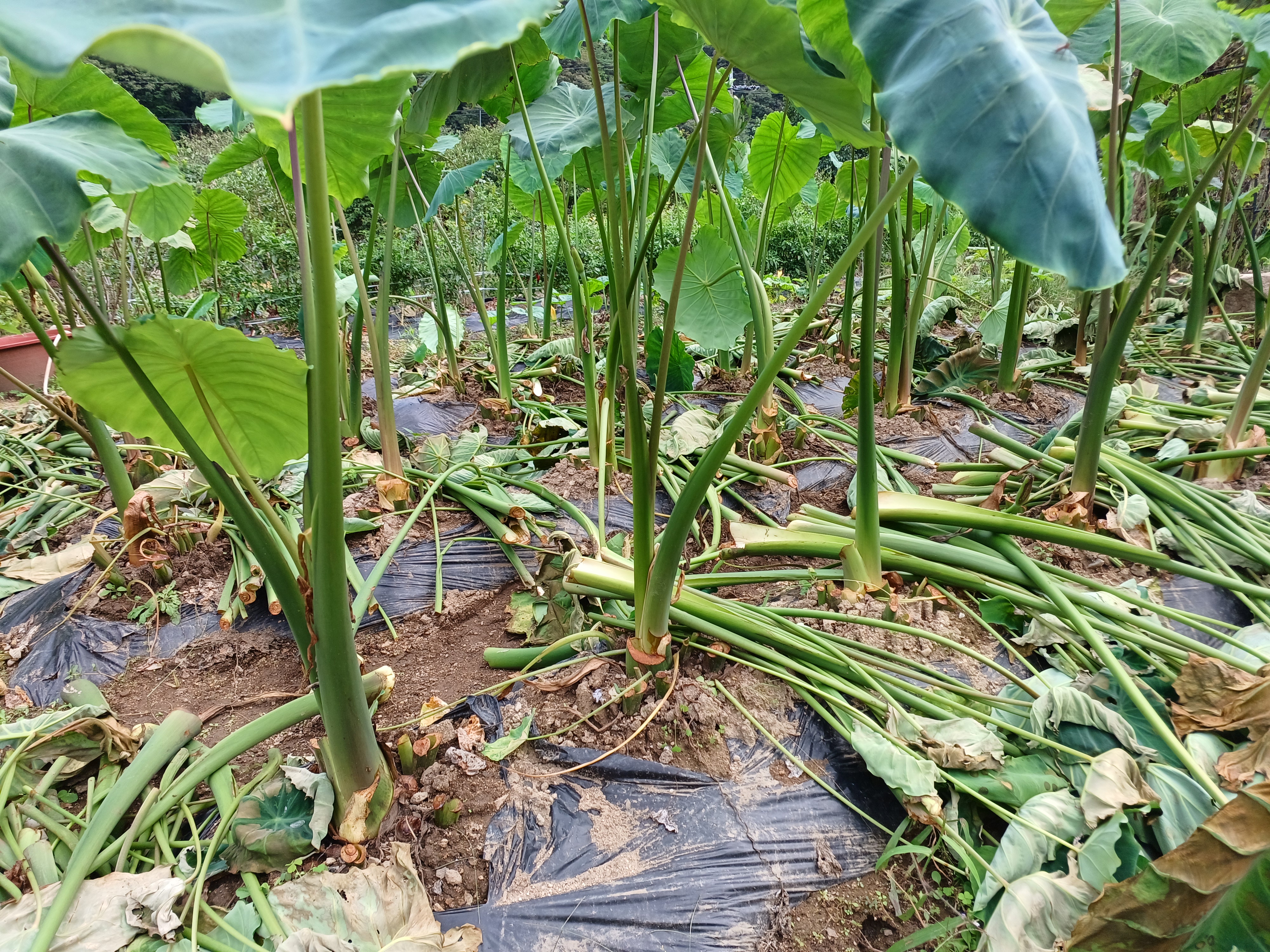 키만큼 자란 토란 넓은 초록 잎으로 물을 빨아올리는 중이었구나