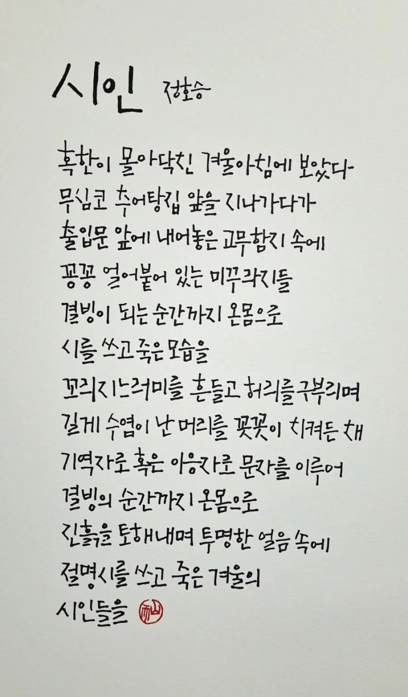우리가 일상적으로 접하는 흔하고 사소한 풍경에서도 색다른 눈으로 보고 사유하며 삶의 서사를 끌어내는 정호승 시인의 시가 한겨울의 청량함만이 아니라 훈훈함을 느끼게 한다